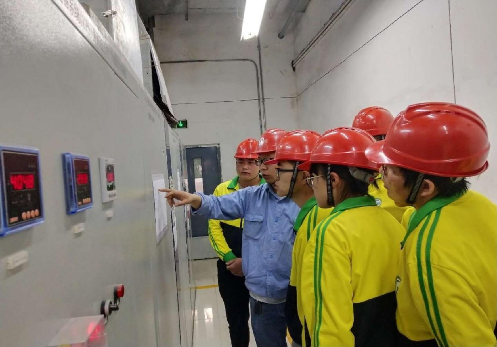 (电厂技术人员向实习学生讲解配电室设备的操作及注意事项等)