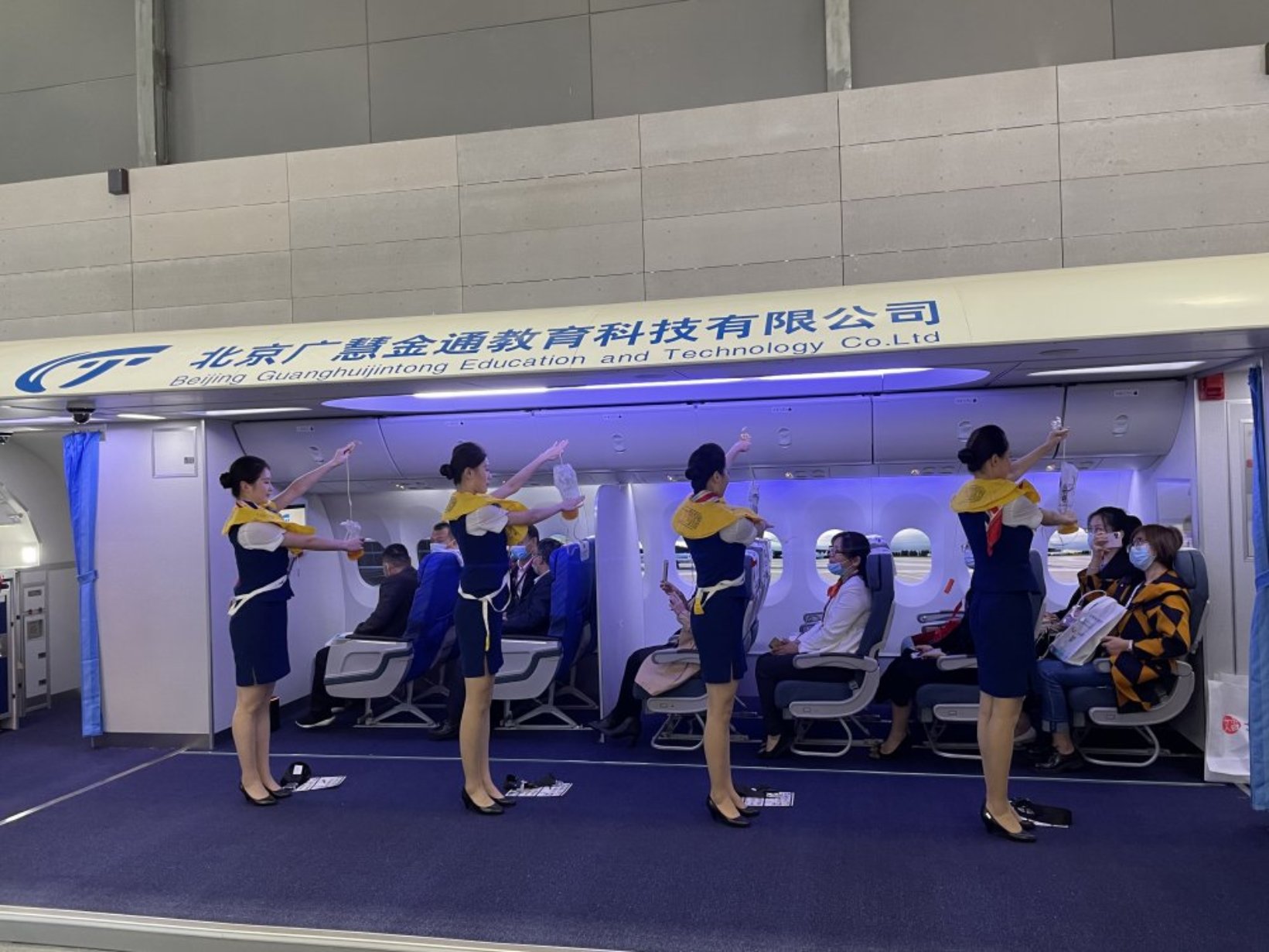 北京广慧金通教育科技有限公司作为协办单位和参展企业,其展位内容主要从公司介绍、校企合作、民航产业学院、教材研发、高质量就业和“校企合作 双百计划”六方面进行介绍说明。详实的内容和具体的数据,充分彰显了金通公司在高等教育民航专业领域积极推动教育和行业的统筹融合、良性互动的示范引领作用。空乘学子在一旁的飞机模拟舱内向前来参展的嘉宾展示客舱应急操作等相关民航专业教学内容,吸引了众多观众驻足欣赏。